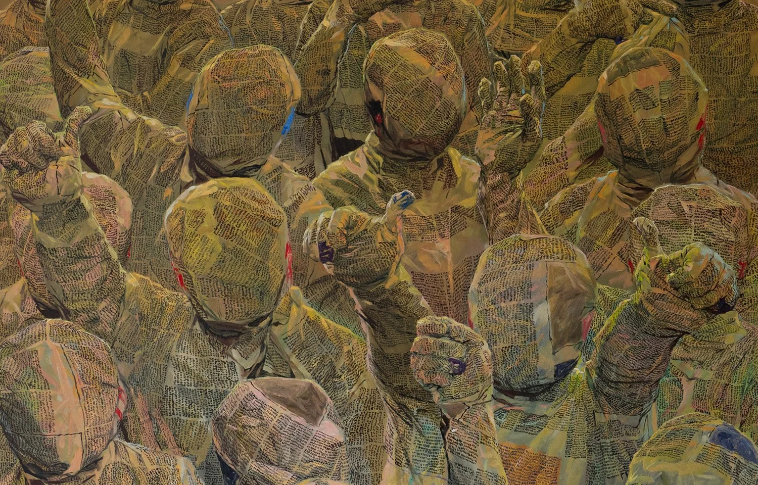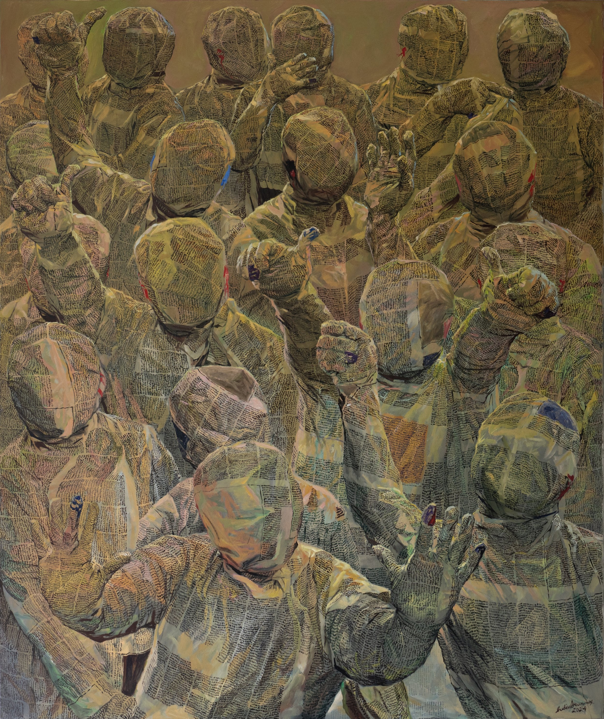 Budi “Ubrux” Haryono (b. 1968, Yogyakarta) is one of Indonesia’s most celebrated contemporary painters, acclaimed for his striking and conceptually profound imagery. His signature figures — faceless and meticulously wrapped in hand-painted layers of newspaper — have become enduring symbols of how media narratives shape, silence, and define human perception.