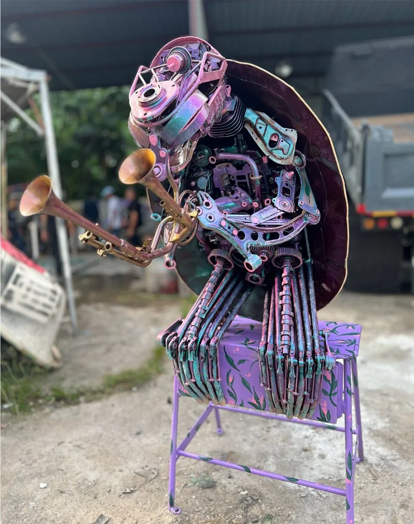 William Koong (b. Malaysia) is a visionary sculptor who transforms scrap metal and construction debris into bold, punk-inspired works of art. Based in Klang, he turns industrial waste into monuments of resistance and renewal. His Endangered Species Series, made from reclaimed automotive parts, raises awareness of ecological fragility while redefining sustainability through raw creative force.