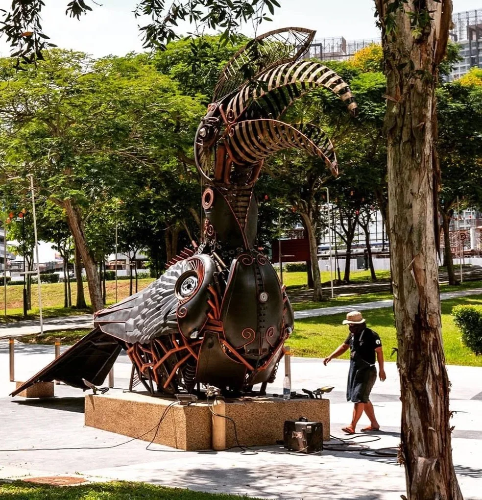 Among his major bodies of work is the Public Art and Endangered Species Series, featuring large-scale sculptures dedicated to Malaysia’s threatened wildlife. Constructed primarily from recycled automotive and construction metal, these works serve as raw, metallic totems — reflections on fragility, survival, and the possibility of renewal.